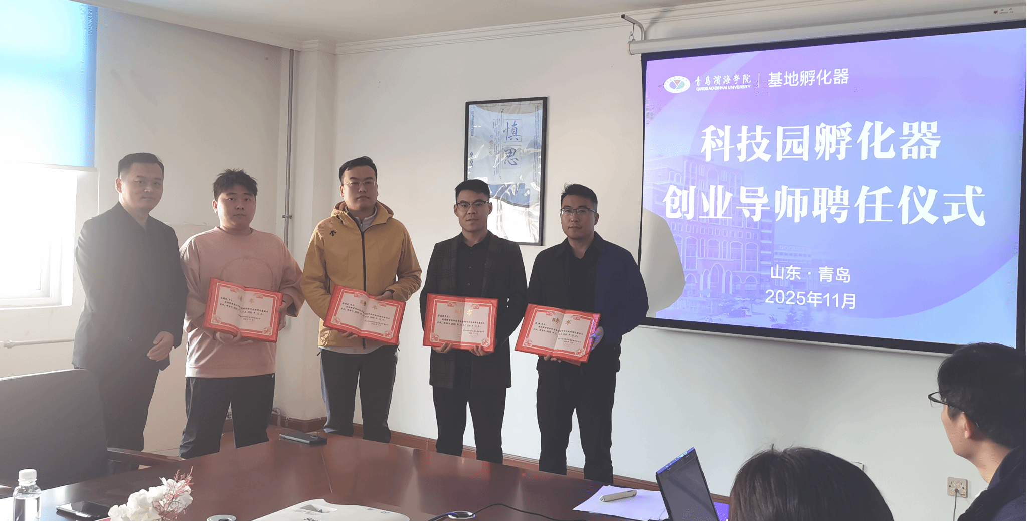 近日,青岛滨海学院科技园孵化器创业导师聘任仪式在昌德楼606会议室举行,旨在充实创业导师队伍、健全孵化服务体系,进一步提升创业成功率。